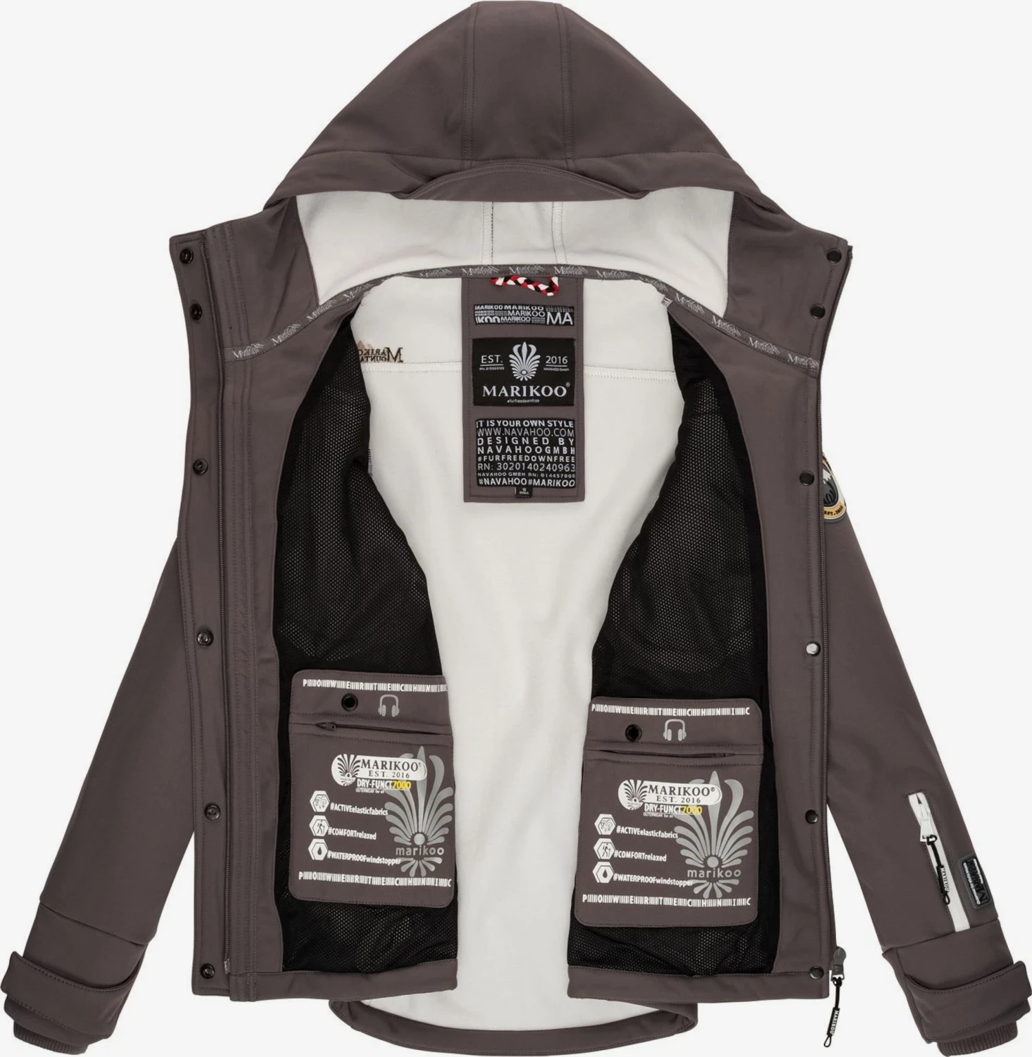 Couleur unieSoftshellVeste softshellBoutonnière avec boutons pressionCapuche avec cordon de serrageFermeture éclair masquéePoche de manchePoche poitrinePoches latéralesEtiquette patch / étiquette flagBroderie de l’étiquetteCoutures ton sur tonTissu lisseLabel PrintAvec capucheLégèrement doubléBouton pression